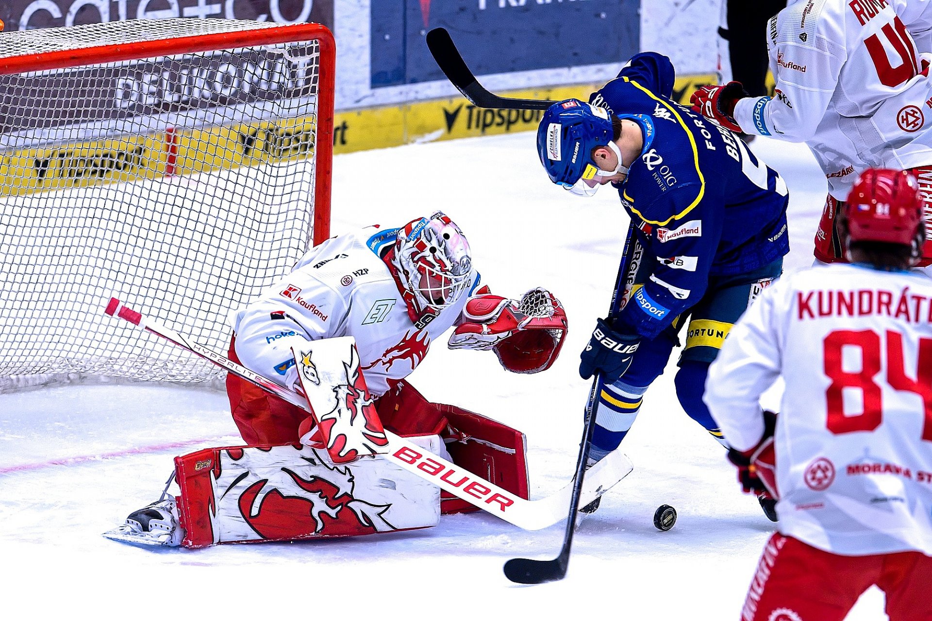 Poprvé do letošního play off zasáhl fantom posledních dvou vyřazovacích bojů Ondřej Kacetl. Třinecký gólman ale musel již po sedmadvaceti vteřinách lovit kotouč ze své sítě, z první větší šance jej překonal domácí kapitán Milan Gulaš, který se prosadil střelou k tyči. Nepřesvědčivý vstup hostujícího celku do utkání pokračoval i nadále, v šesté minutě Kacetl likvidoval nebezpečnou střelu Kachyni.